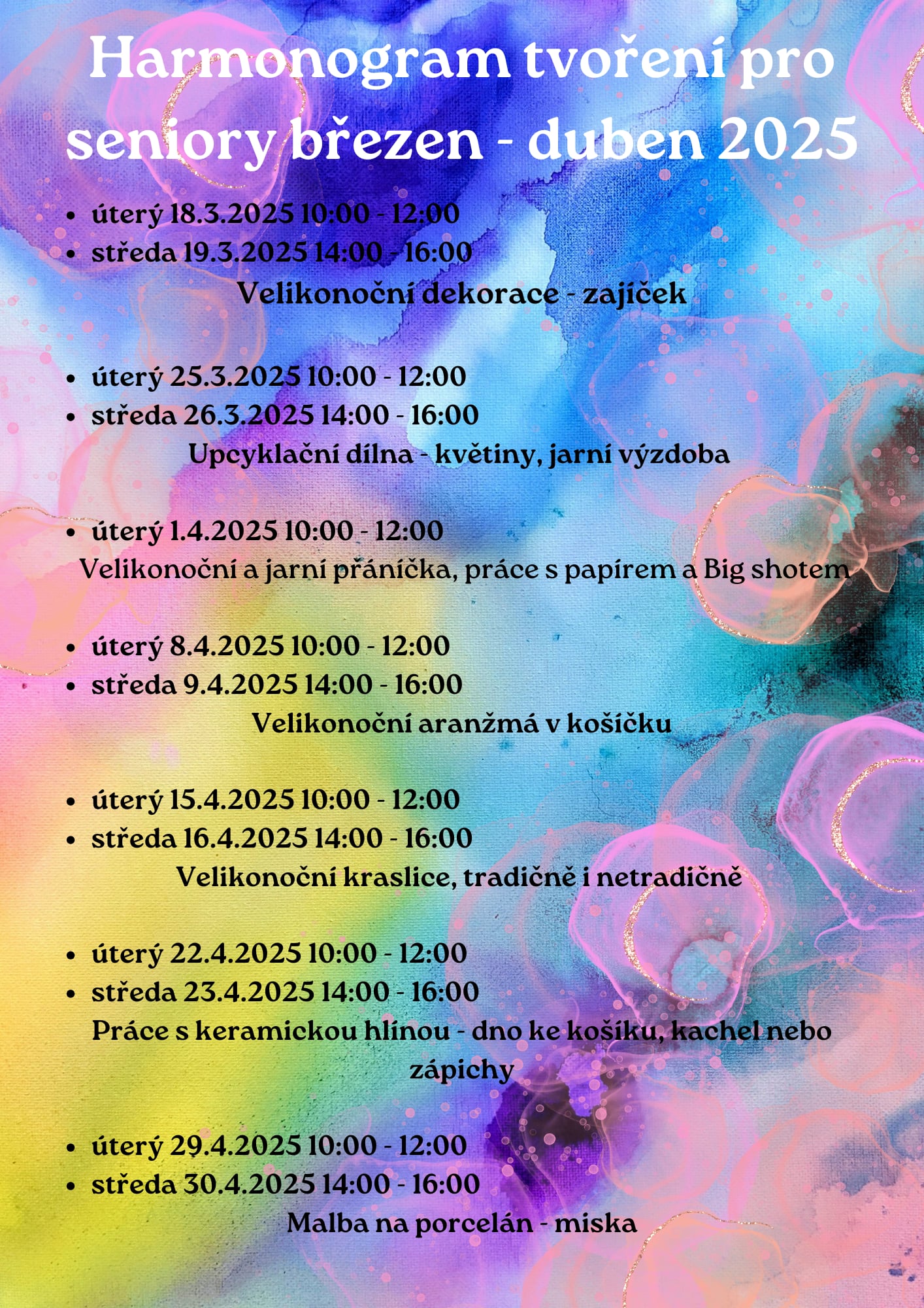 Program zahrnuje velikonoční dekorace, upcyklační dílnu, práci s papírem, aranžování, malování na porcelán a další zajímavé aktivity.
